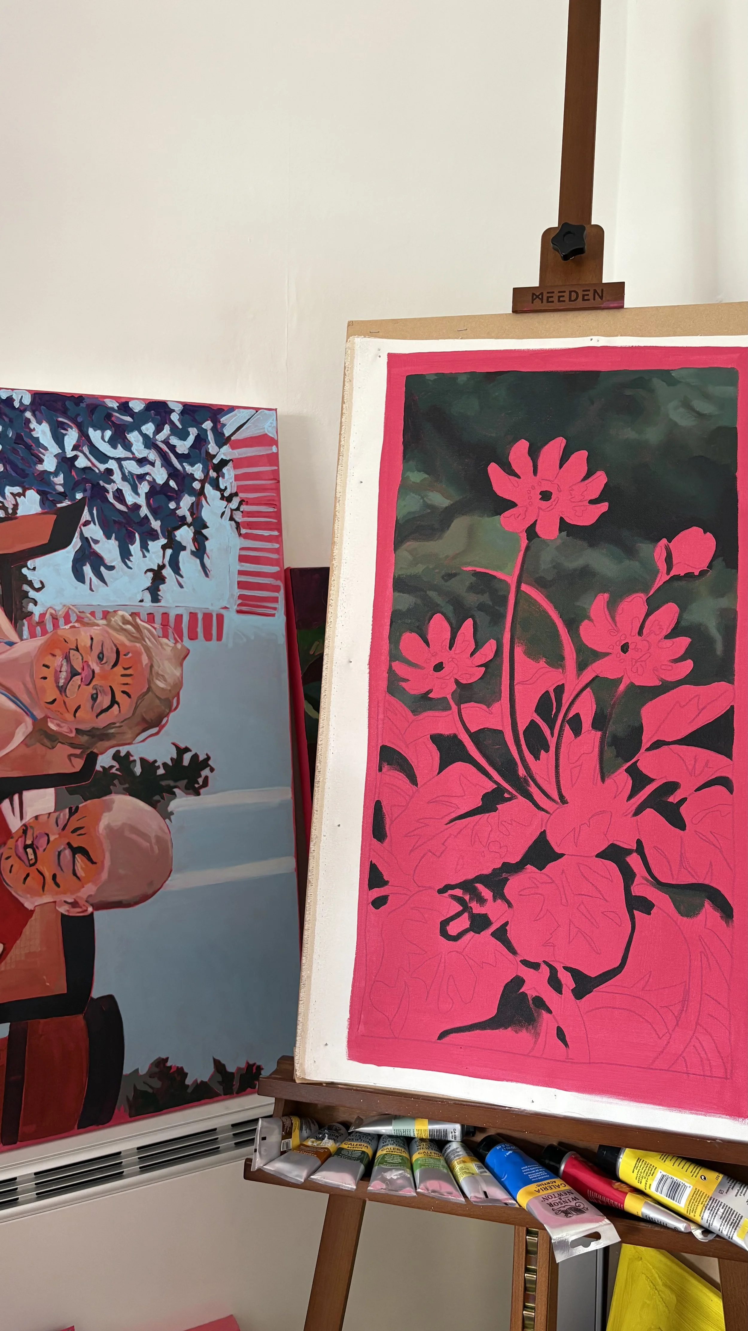 Which brings us onto the third reason why I use a pink underpainting; it’s boldness. I love to play with the negative space throughout my painting and their compositions, and having pink fill that space creates something special and different. Leaving the pink linework from the underpainting throughout the paintings has become somewhat distinct and recognisable to my work, I love how unique it is. It’s at the core of my artistic practice and isn’t something I see changing anytime soon.